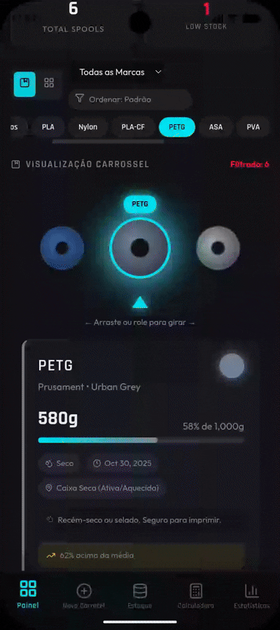 Gerencie estufas e prateleiras virtuais. O app rastreia há quantas horas sua bobina está exposta ao ambiente e te alerta no exato momento em que ela deve voltar para a secagem antes de arruinar sua peça com umidade.