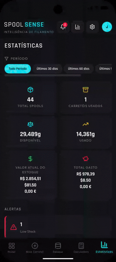 Assuma o controle total do seu estoque. Calcule o material exato, antecipe faltas de filamento e passe a imprimir com previsibilidade e lucro.
